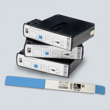 -Bracelets Zebra BLEU pour adulte format 25mmx279mm en polypropylène thermique direct, souple avec un adhésif inviolable pour la fixation. 200 bracelets par cartouche, 6 cartouches par boite. Les bracelets sont dans une cartouche à chargement facile pour les imprimantes HC100 & ZD510-HC.