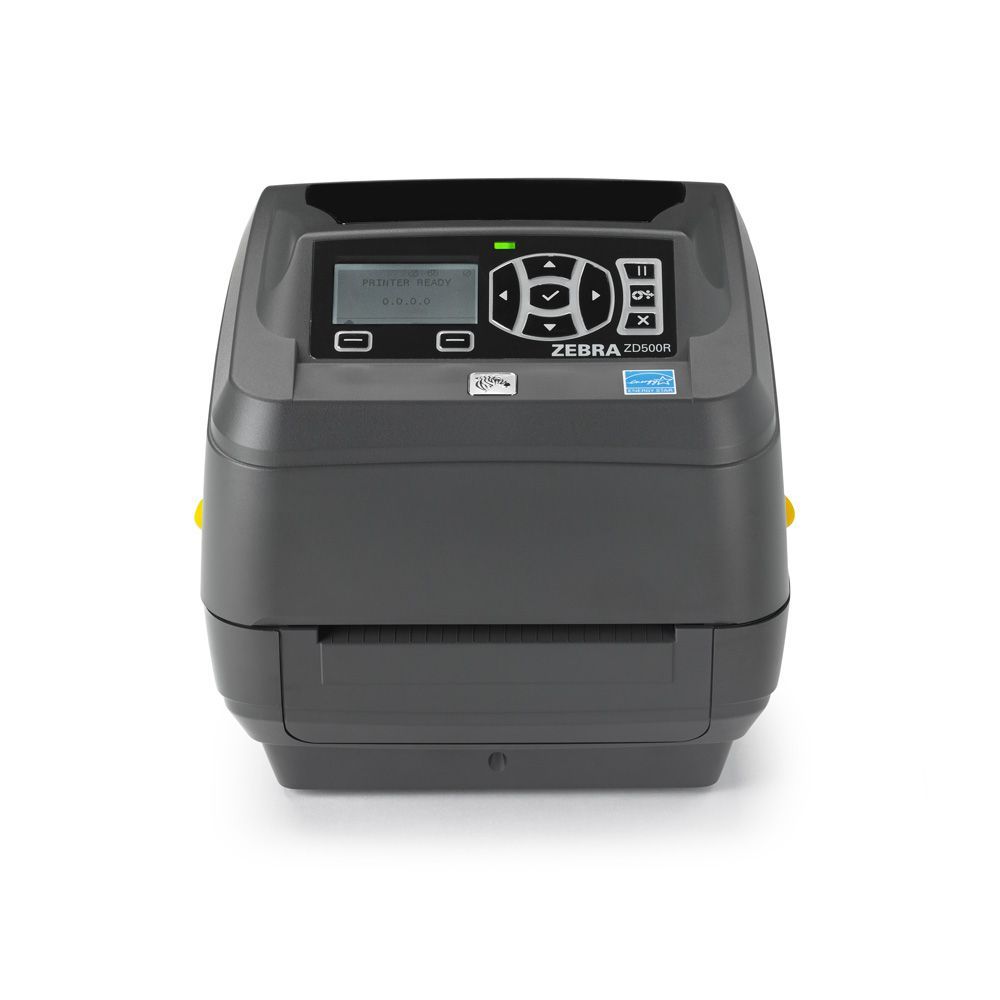 -Imprimante étiquette de bureau Zebra ZD500 RFID avec encodeur UHF, transfert thermique en 203 dpi et 104 mm de largeur d’impression, avec option massicot, interface série, parallèle, USB et Ethernet, 256Mo de mémoire Flash, 128Mo de SDRAM.